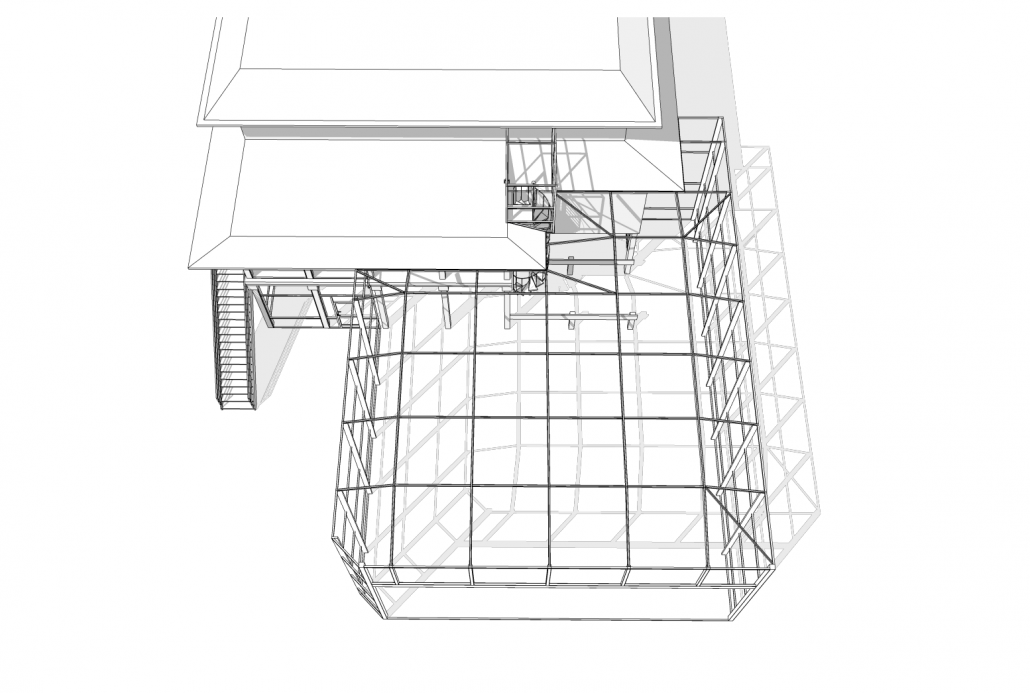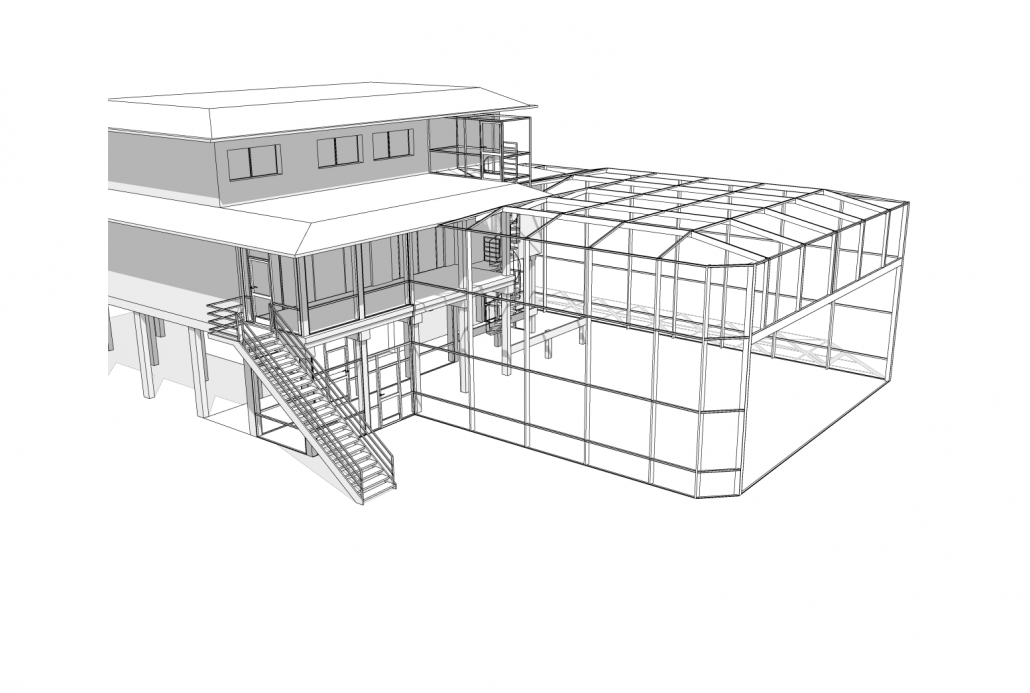 The main request was to recreate the destroyed cage, but also to take the opportunity to make it better. The house stands on pilings, which makes it essentially three stories tall, with the first level serving as a non-living space. This added complexity to the design process, since the new enclosure needed to align with the proportions of the tall structure while also enhancing the outdoor view. After discussing the design details, the homeowner decided on a white frame for the new cage, ensuring that it blended seamlessly with the style of the house.