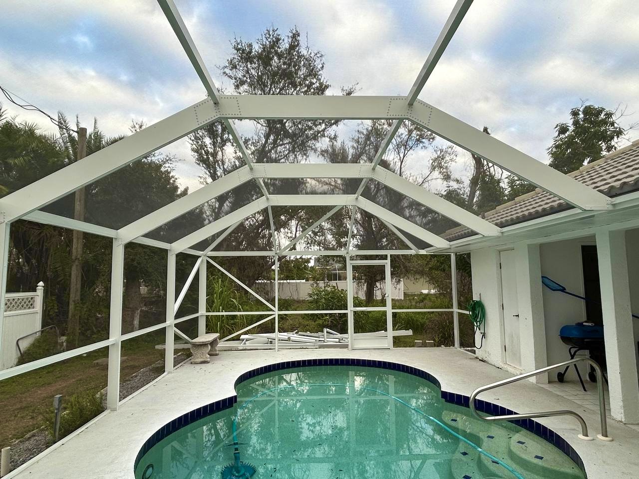 Pool Enclosures: Specifically designed to surround the pool area, our pool enclosures ensure safety, reduce maintenance, and keep your pool free from pests and debris. These enclosures are built to withstand the humid Florida climate and provide a secure barrier around your swimming pool.