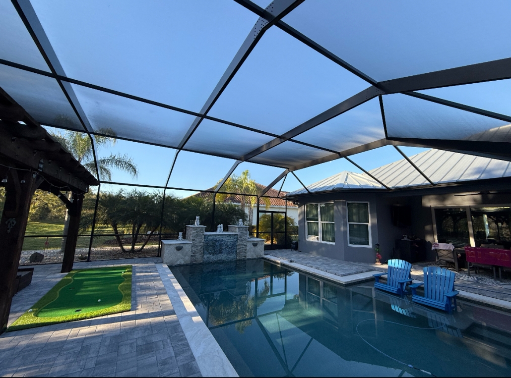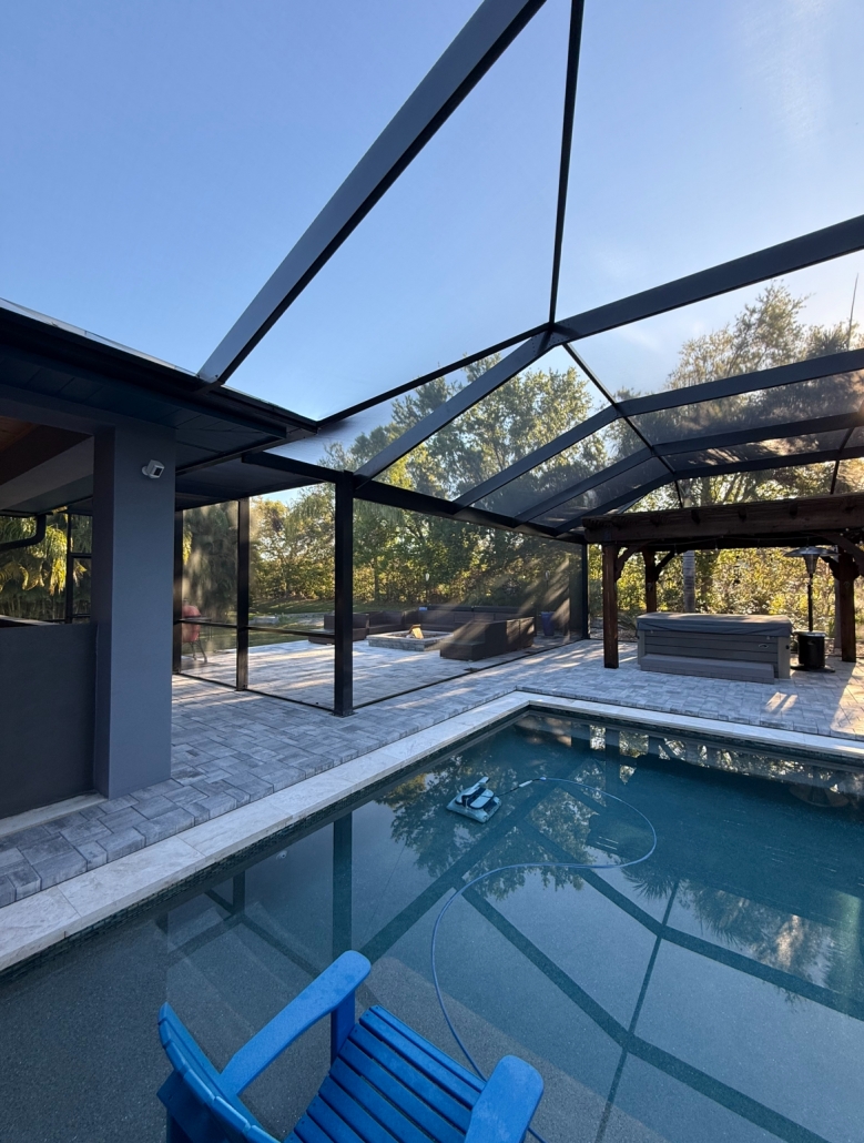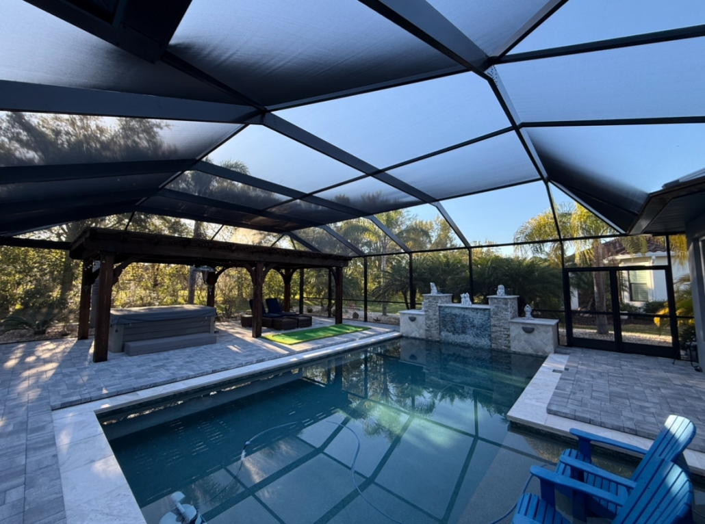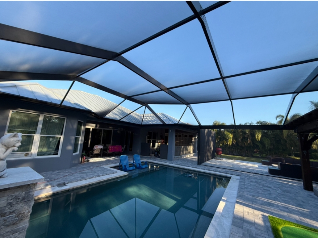 We completed the installation of a new pool enclosure in Bradenton for a client whose previous structure was damaged by a hurricane. The project involved dismantling the old enclosure and constructing a new screen cage with enhanced visibility and durability.
