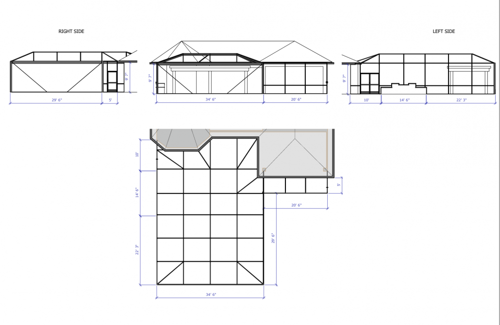 3. Creating and Approving the Design – developed the L-shaped pool enclosure plan with picture view, a mansard roof, and optimized door placement, then finalized it with the client.